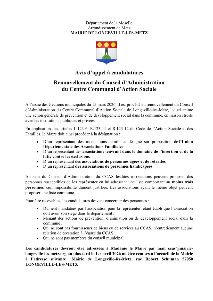 Dans le cadre du renouvellement du Conseil d’Administration du CCAS de Longeville-lès-Metz, la commune lance un appel à candidatures auprès des associations locales œuvrant dans les domaines de la solidarité, de l’insertion, des familles, des personnes âgées, des retraités ou des personnes en situation de handicap.
